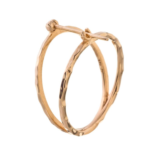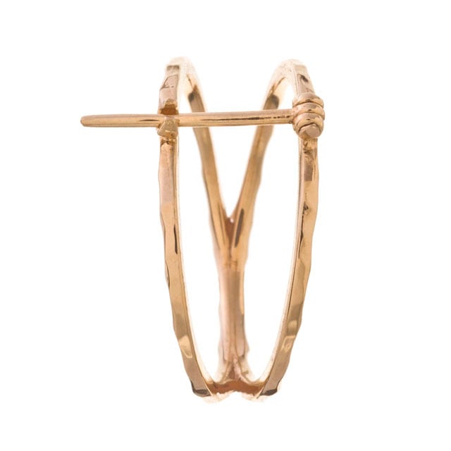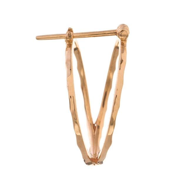 優しく女性らしい曲線を描くサークルデザインピアス。2連のサークルをV字に繋げたデザインは、角度によって見える形が変わりユニーク。 立体感あるフォルムに、きらきら見せる表面の加工が、ワンランク上の質感を演出。ビジネスシーンでも使え、どんな装いにもしっくりと馴染む、万能なデザインです。いつものコーディネートにプラスするだけで、新鮮な表情に見せてくれるアイテムです。