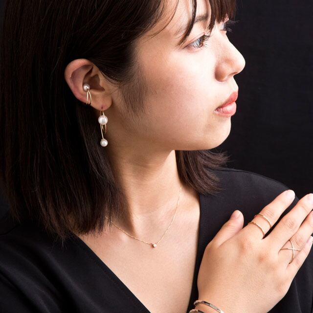 金のワイヤーが繊細で、お洒落な2連重ね着け風リング。指の空いた空間も手元を繊細に見せてくれ、女性らしさを引き立てます。着ける位置によって違う表情を見せてくれる、飽きの来ないデザイン。ミニマルで無駄のないデザインながらも、印象に残るフォルムがオシャレです。リングは槌目加工が施してあり、キラキラと光を反射します。人とは被らないモードなリング。お洒落な重ね着け風で重たく見えないのもGOOD。デイリーで使いやすく、どんなファッションにも相性抜群。